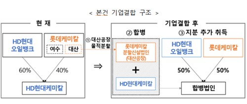이번 기업결합은 롯데케미칼이 대산공장을 물적분할하고, 이후 분할신설법인이 HD현대케미칼과 합병해 HD현대케미칼이 존속하는 내용을 골자로 한다.