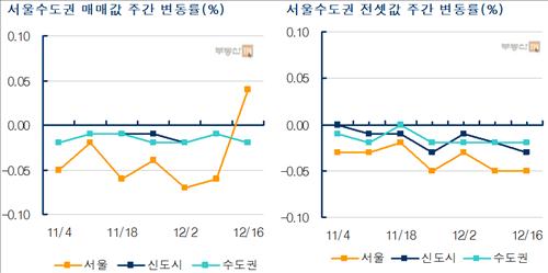 <그림설명=서울ㆍ수도권 매매,전세값 주간변동률.(출처:부동산114)>