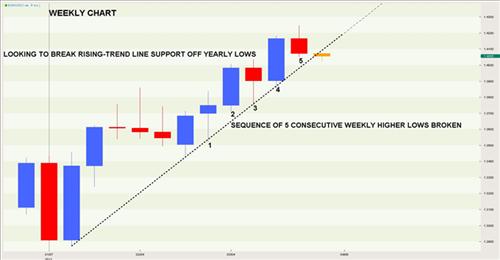 <최근 유로-달러 주간 차트. 이번주 들어 환율은 1~5번까지의 상승 추세를 벗어난 모습이다(출처:데일리fx)>